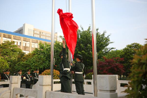 伴随着雄壮的国歌,升旗仪式拉开了纪念活动的帷幕,擎旗手用力一展,鲜艳的五星红旗在晨光中冉冉升起,随风飘扬,升旗仪式现场庄严肃穆,全体师生面向国旗肃立行注目礼,用心感受着国旗升起的庄严时刻。升旗仪式后是2019年新入团团员入团仪式。校团委副书记武文斌宣读了入团仪式意义, 宣布2019年新团员名单。与会领导向新团员代表佩戴团徽、颁发团员证。在学生处副处长、校团委书记仲华志带领下新团员进行了入团宣誓,老团员们重温了入团誓词,完成了庄严而神圣的入团宣誓。来自文学院的张颖同学做了《在国旗下宣誓》的主题发言,抒发了当代学生勇于担当的历史使命感和励志成才的进取精神,展示了我校青年学生积极向上的精神风貌和高尚的道德情操。
