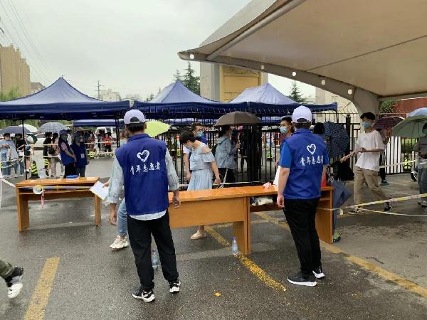 在考试过程中,忽然下起的大雨没有影响志愿者们服务的热情。他们竭尽全力为考生服务,以免天气影响考生发挥。
